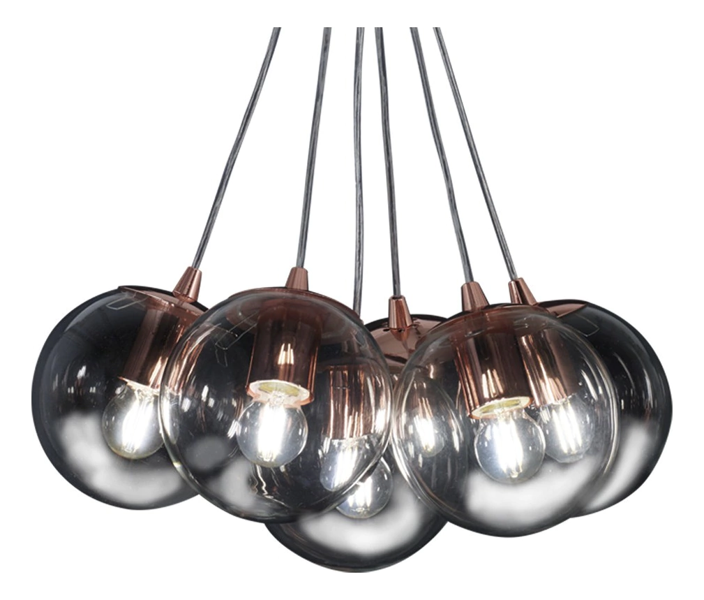 Lámpara colgante construida en vidrio con detalles en color cobre o cromo. Disponible en 15, 18 0 25cm de di metro.